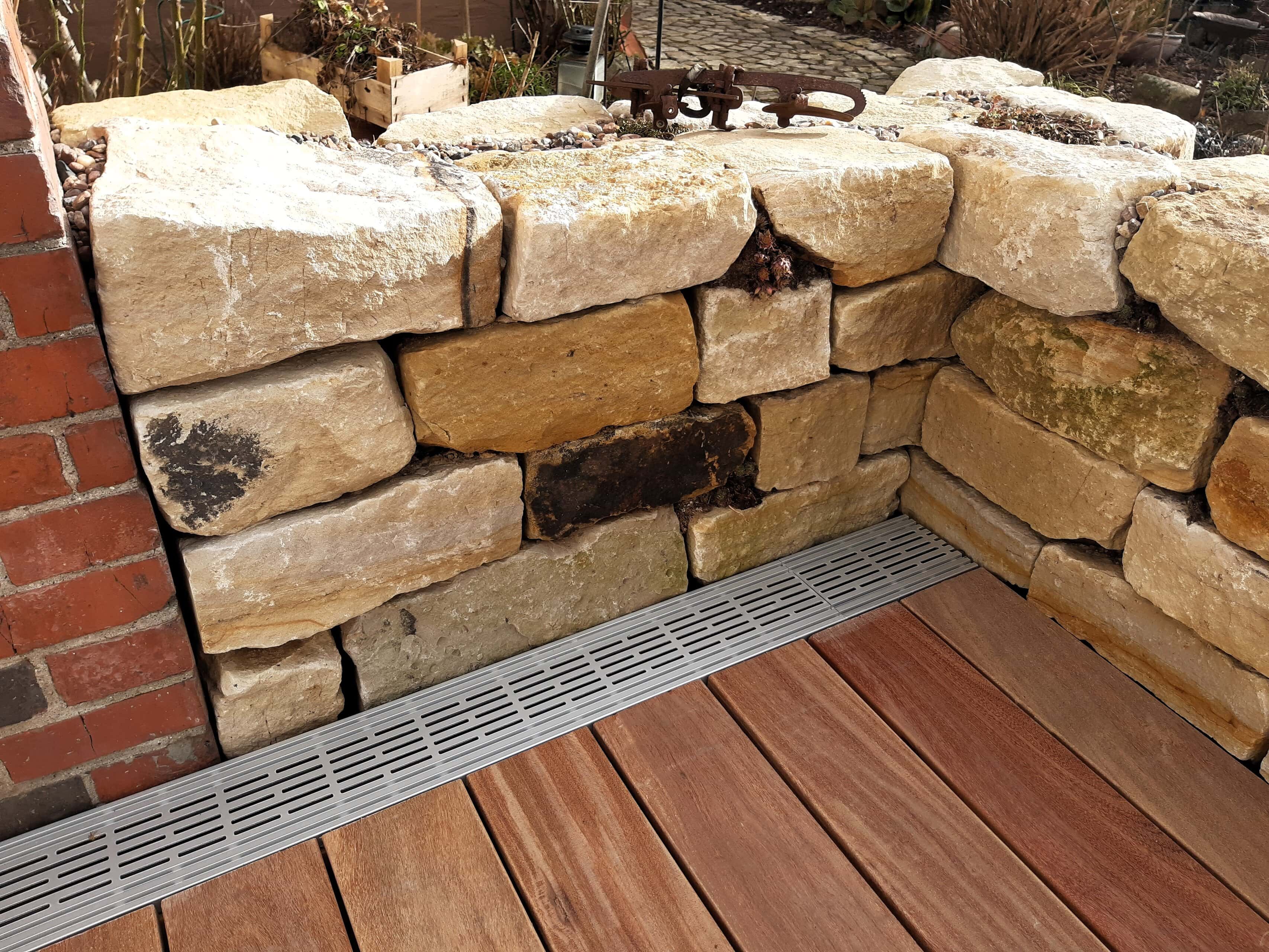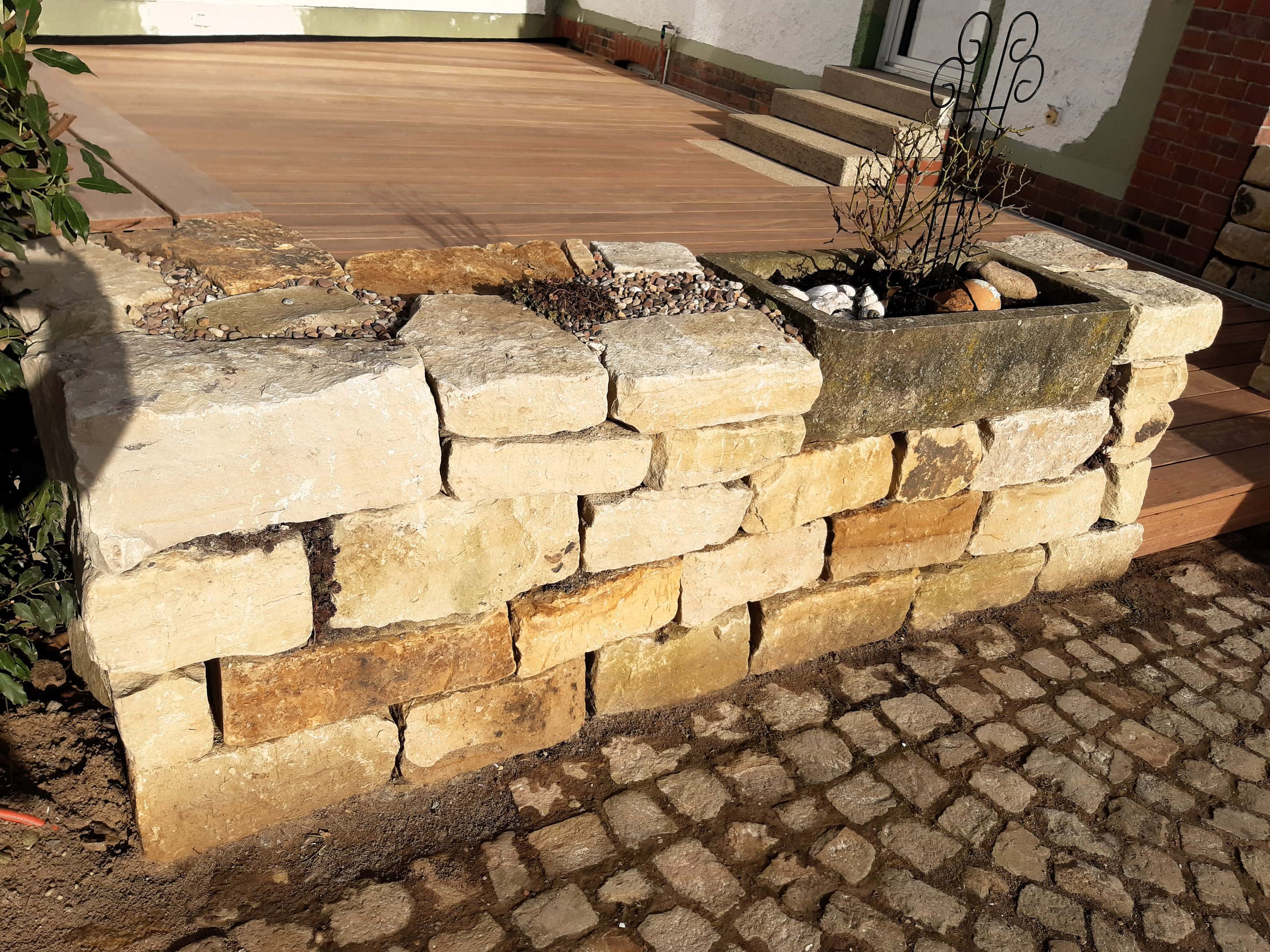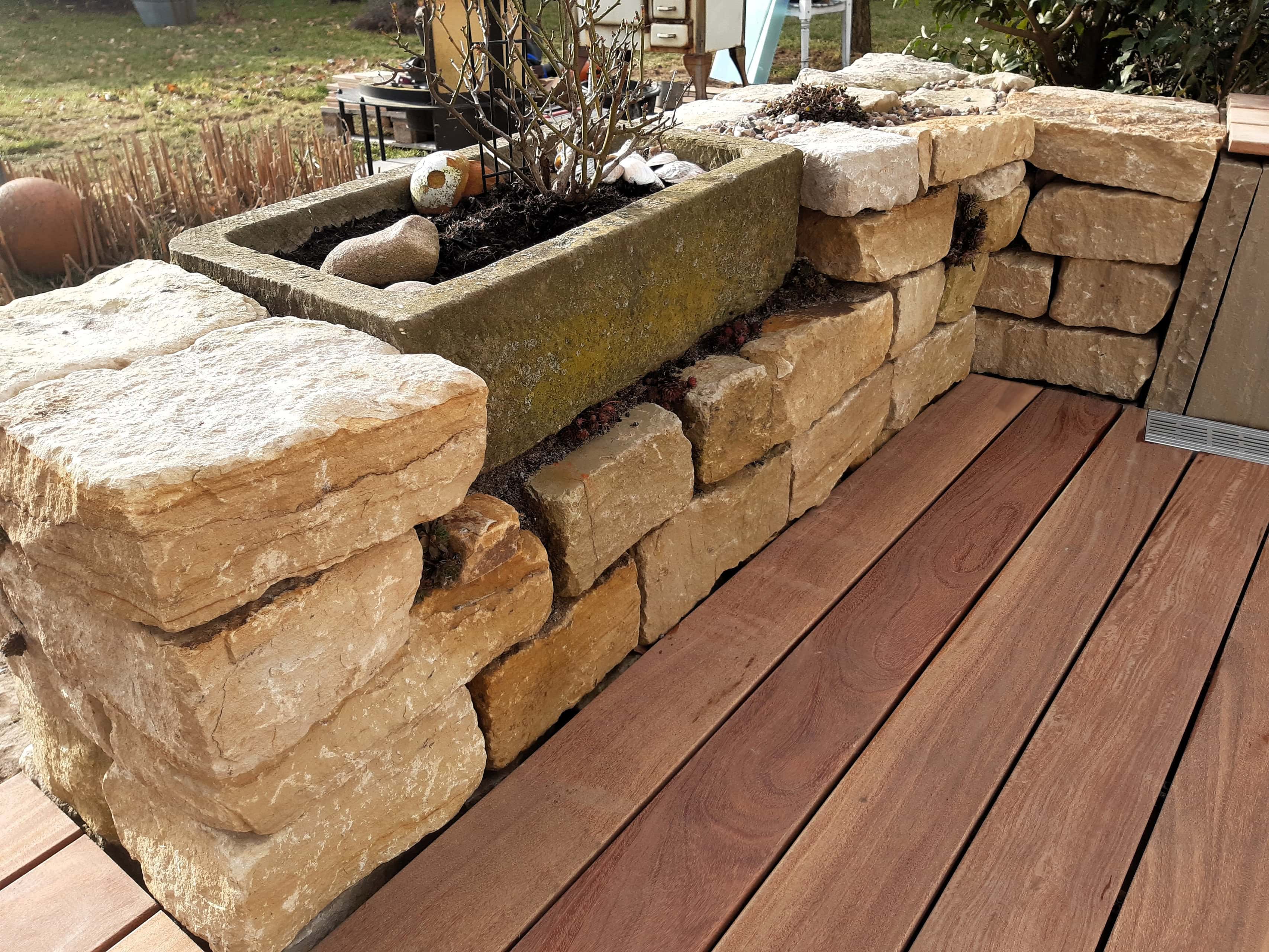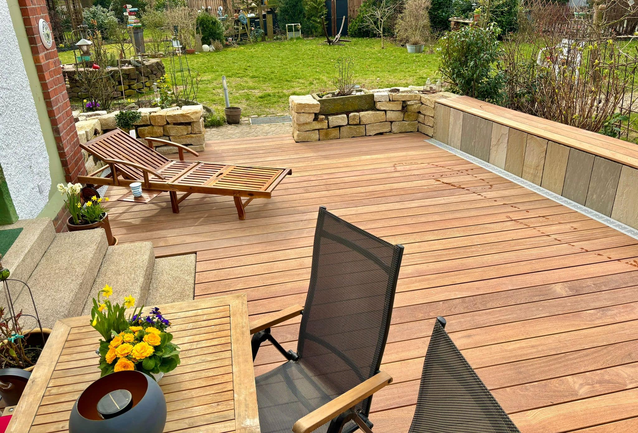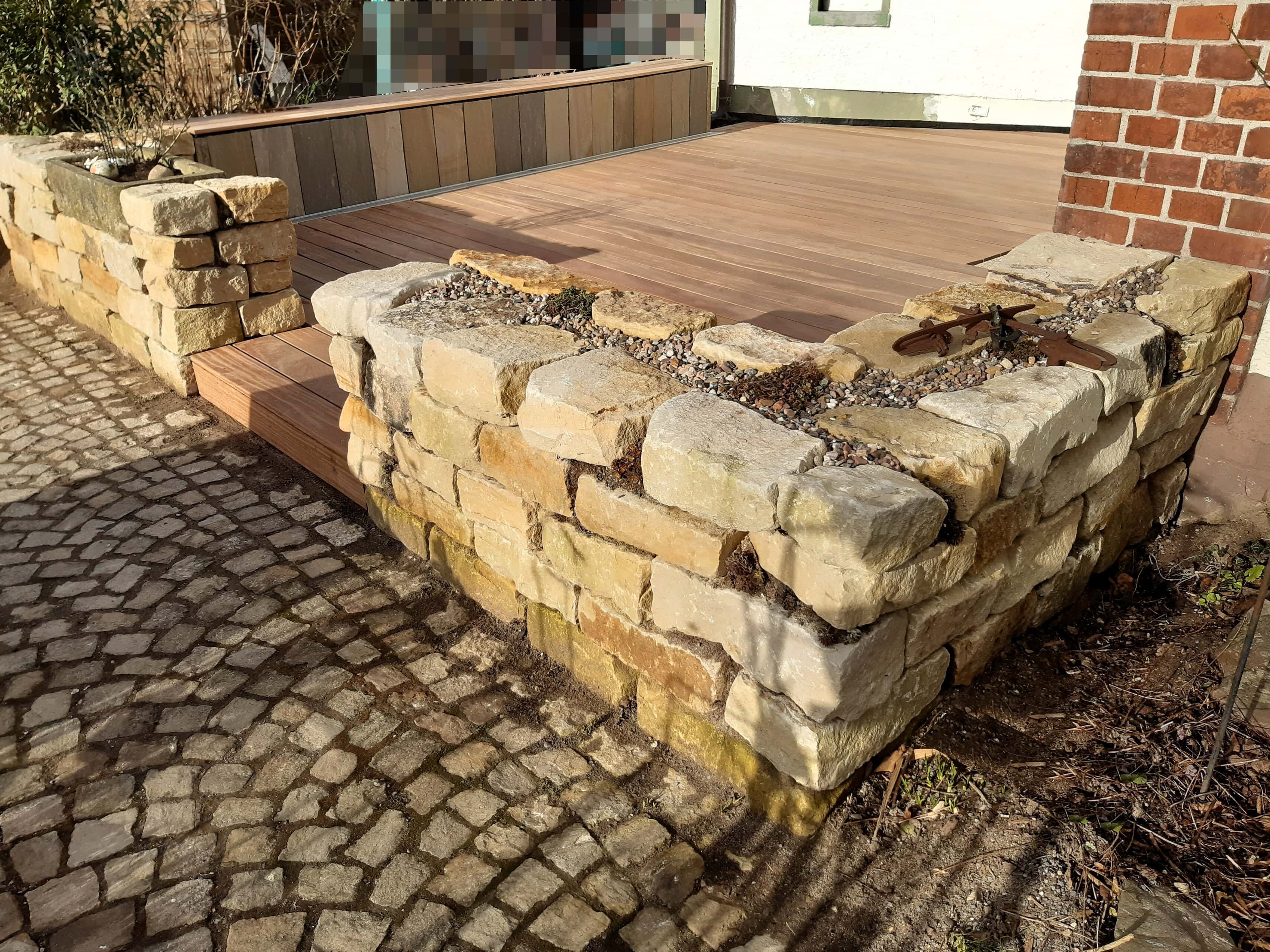 Hier wurde eine Terrasse aus Cumaru-Holzdielen umgesetzt, eingefasst von einer Trockenmauer aus Obernkirchener Sandstein. In den Spalten der Mauer wachsen Mauerpflanzen, die für natürliche Akzente sorgen. Eine integrierte Sitzfläche aus Cumaru-Holzdielen auf Sandsteinpalisaden rundet das harmonische Gesamtbild ab.