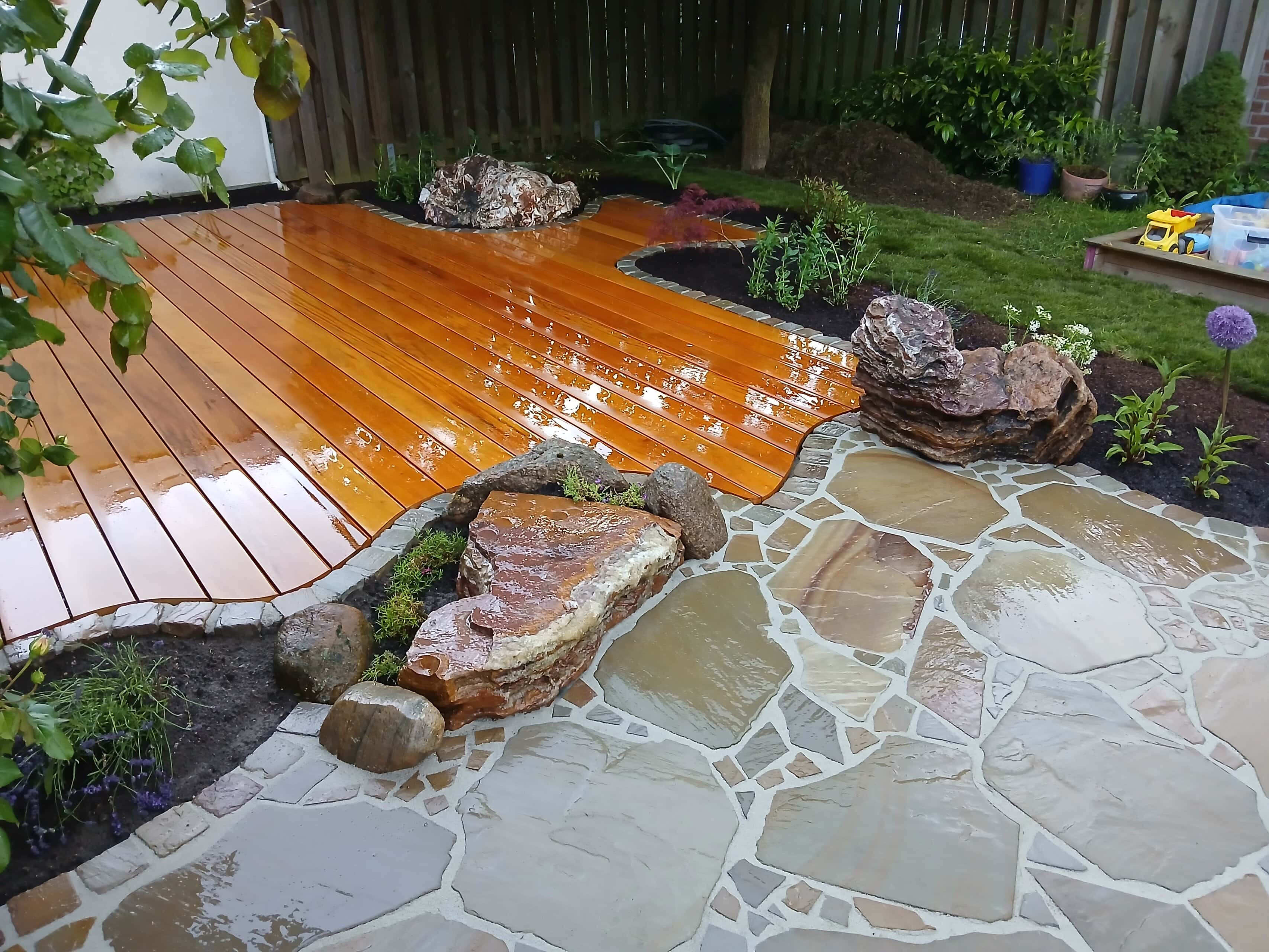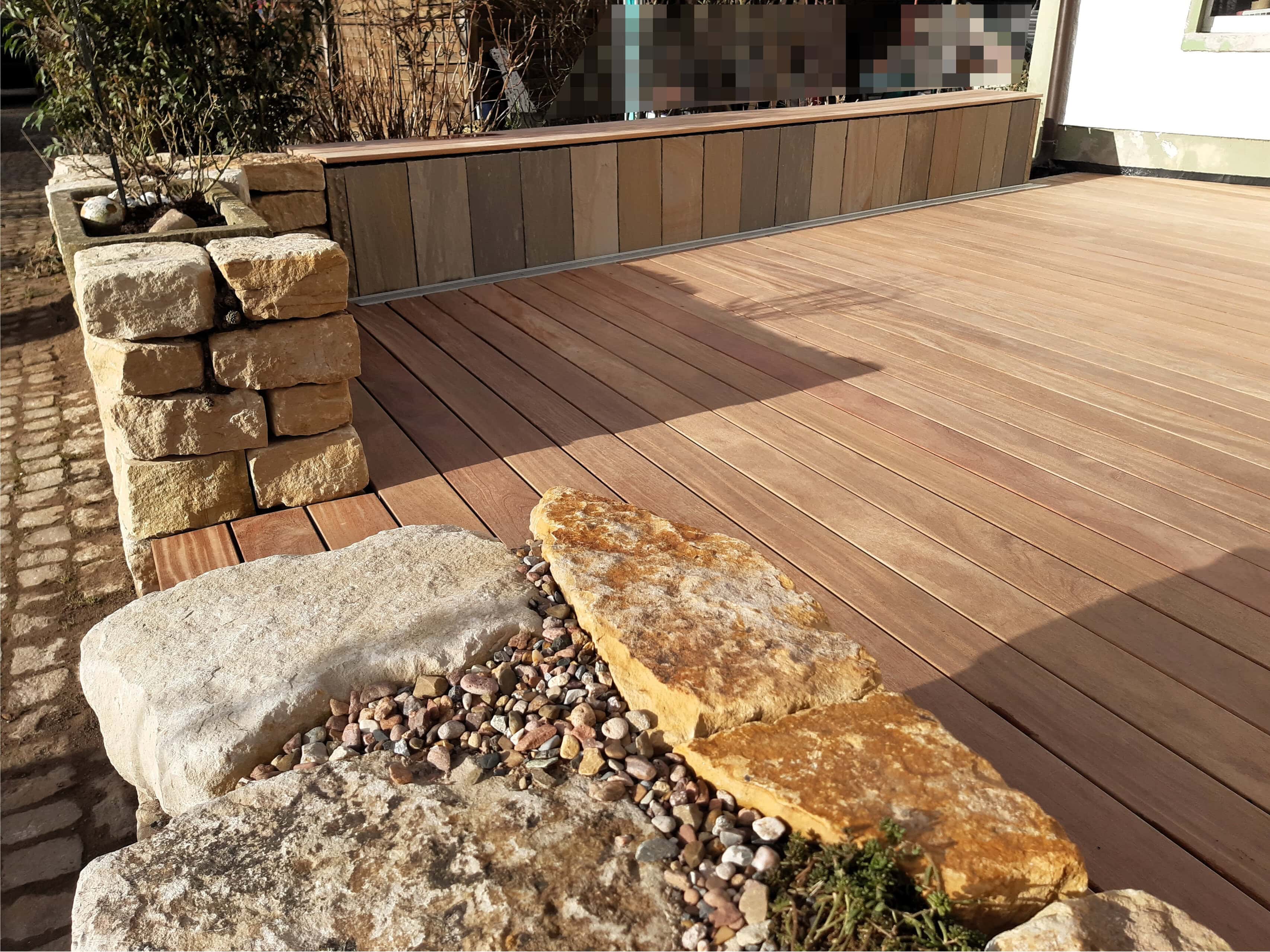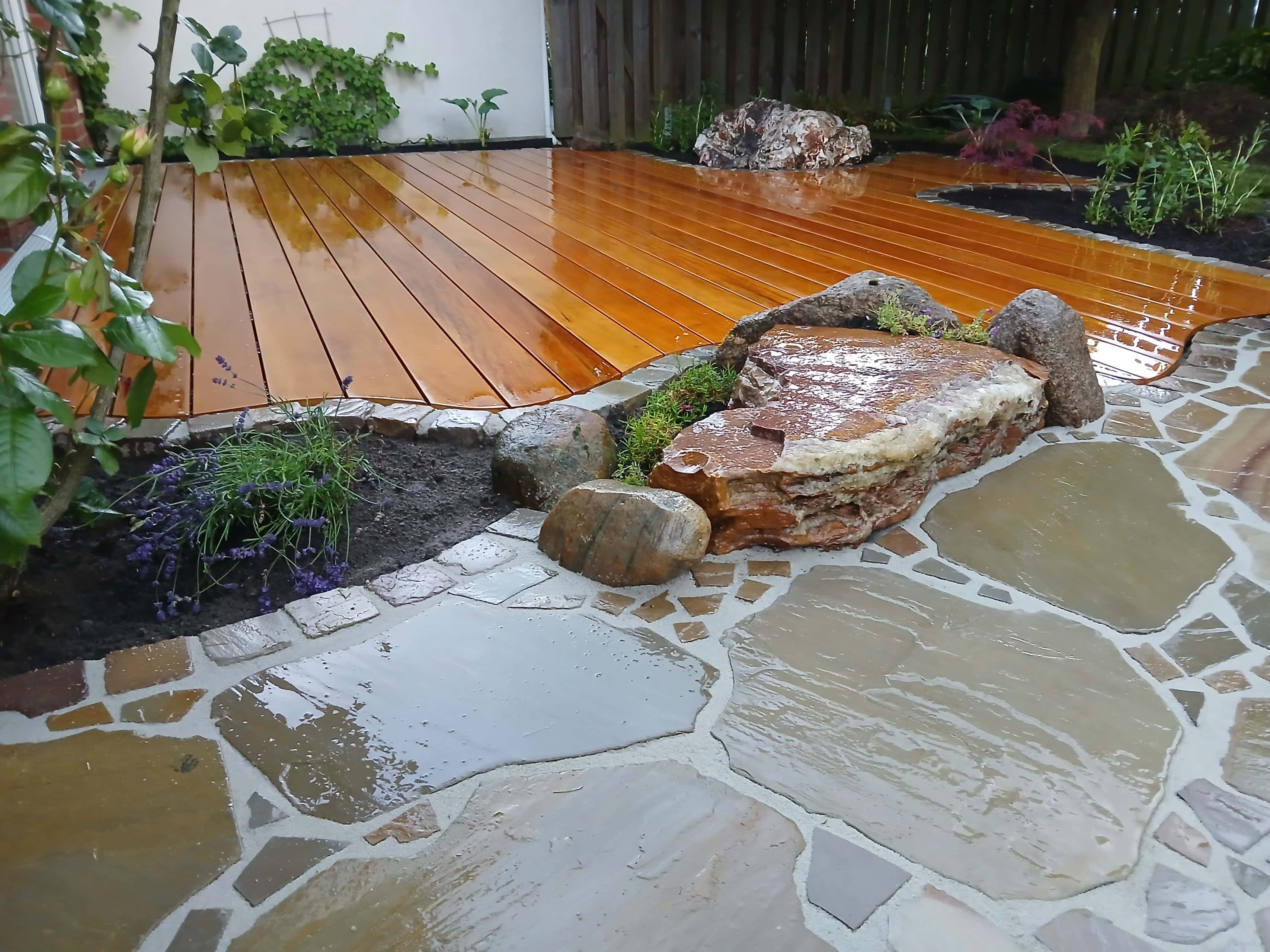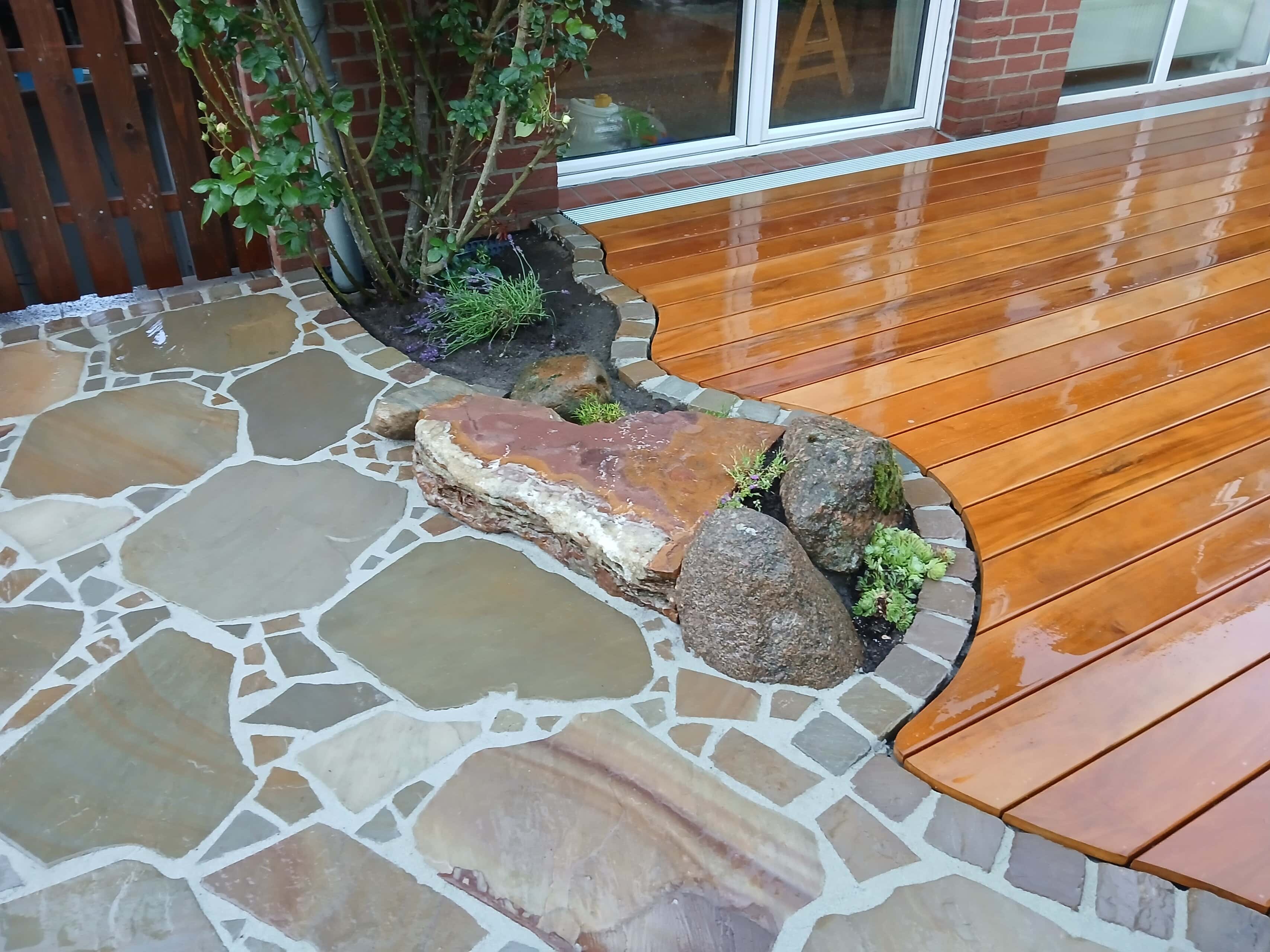 Freiformterrasse aus Garapa-Holzdielen mit Polygonaler Natursteinfläche