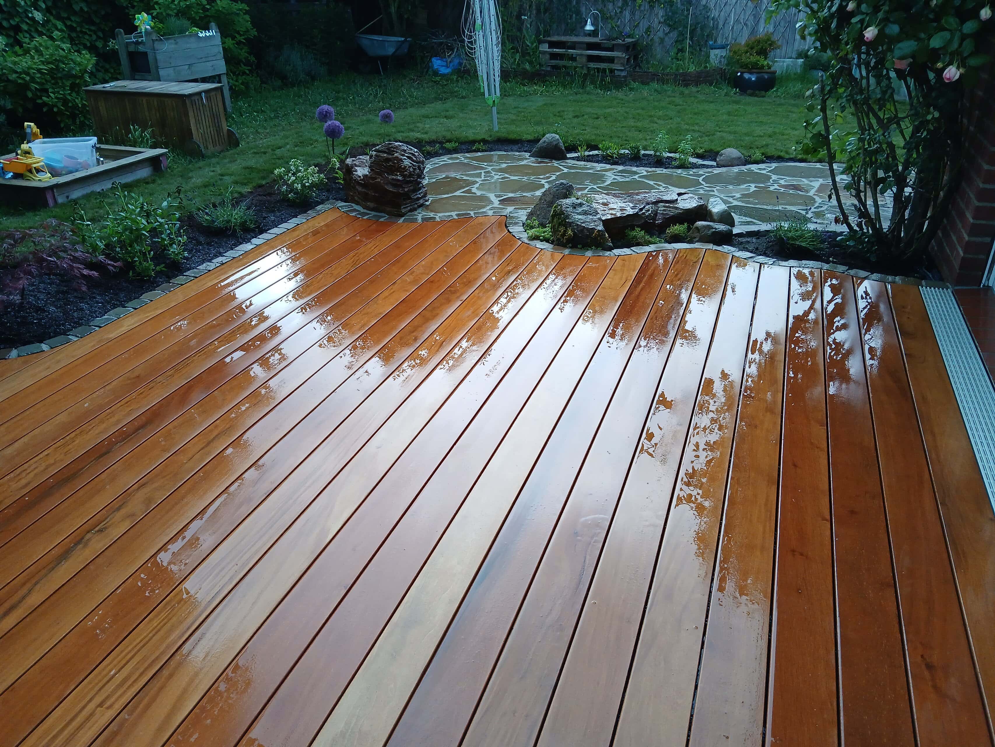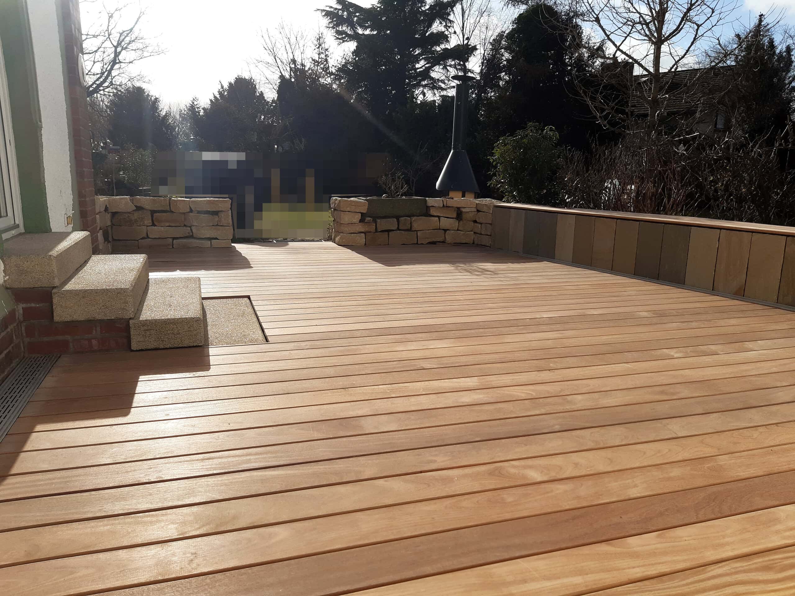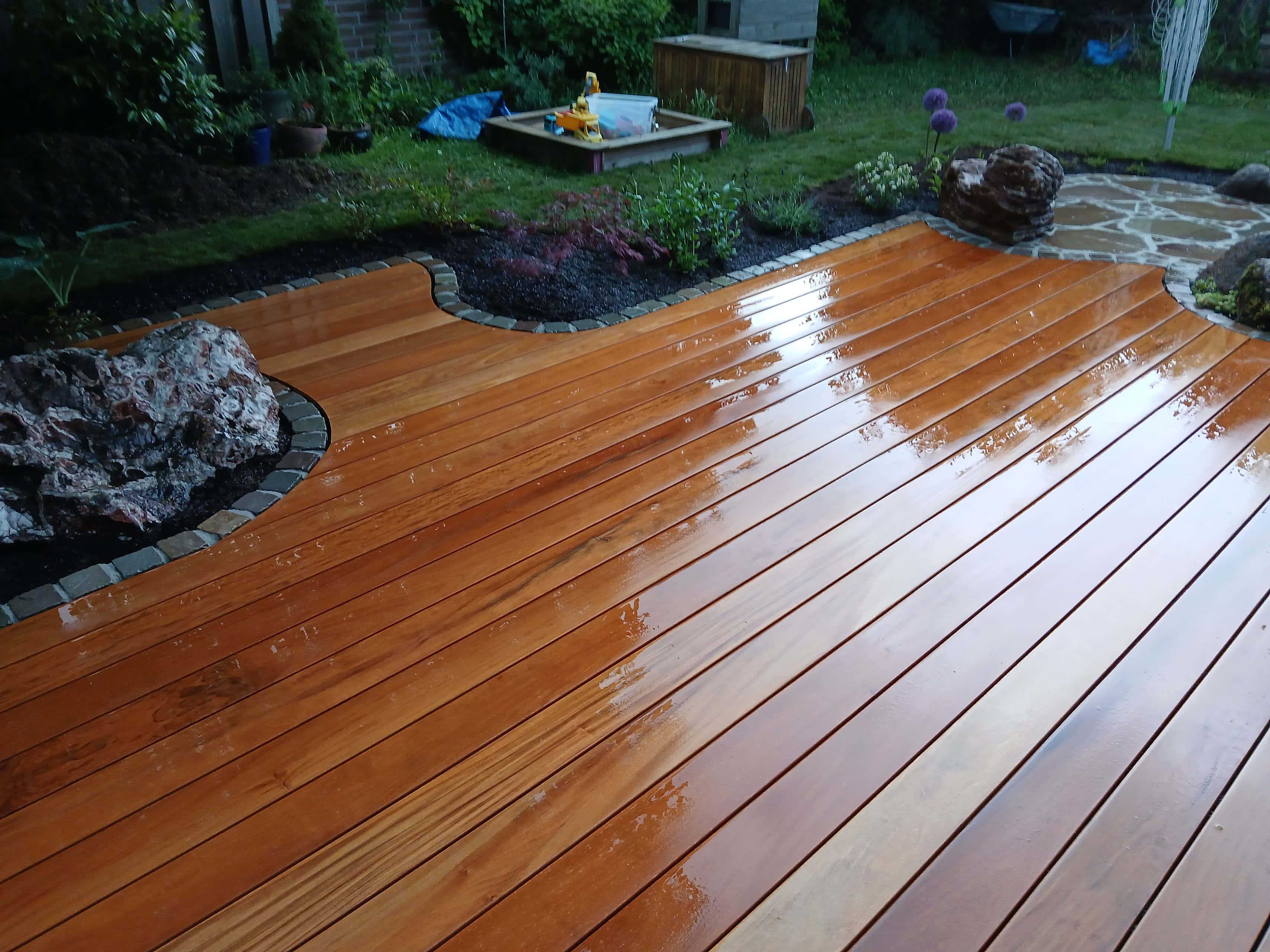 Freiformterrasse aus Garapa-Holzdielen mit Polygonaler Natursteinfläche