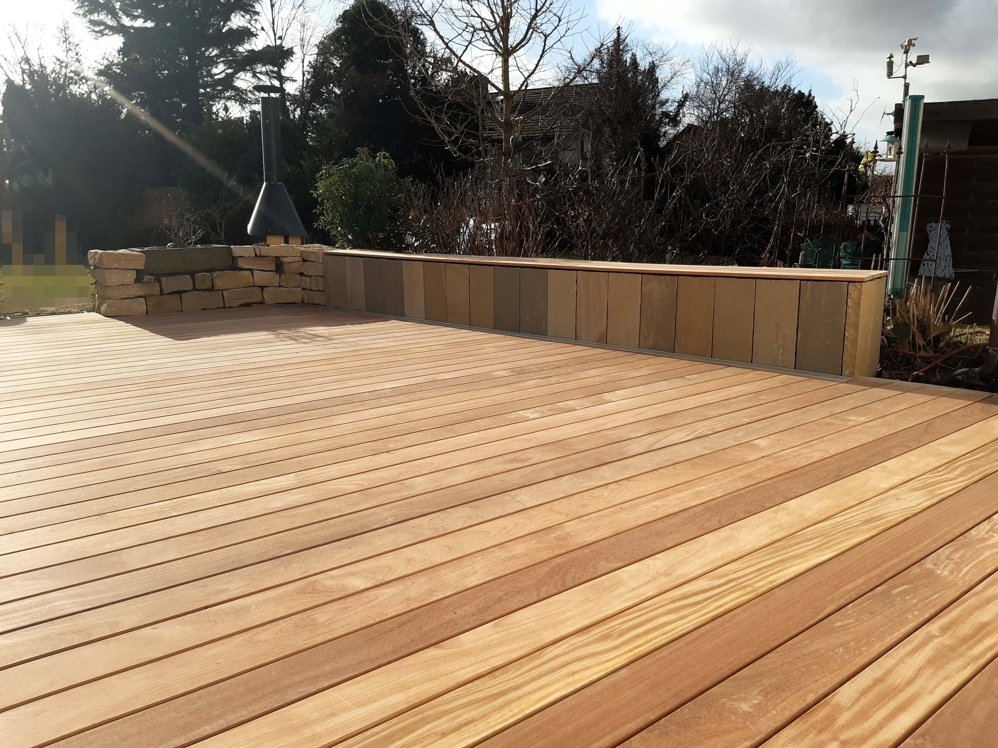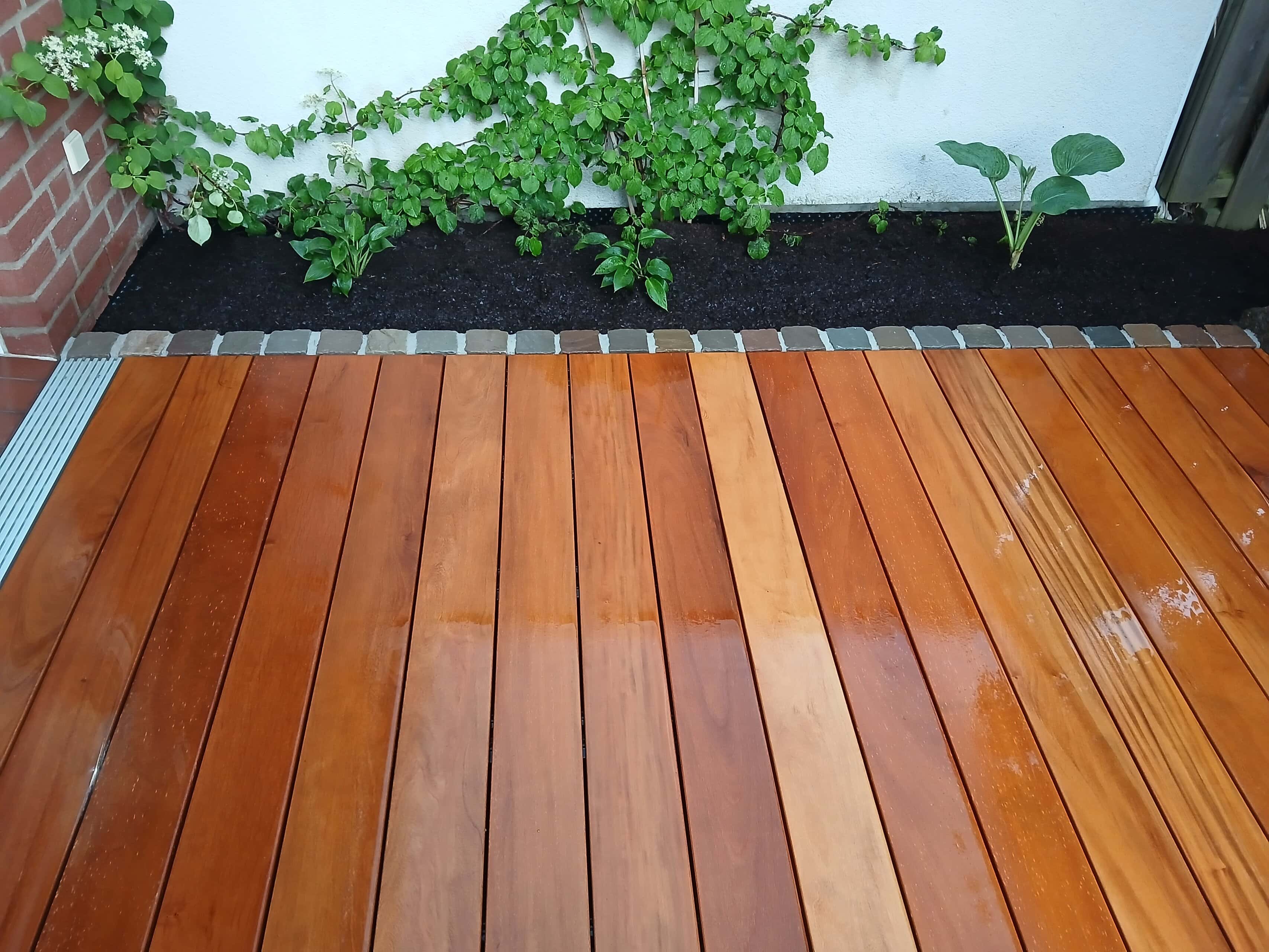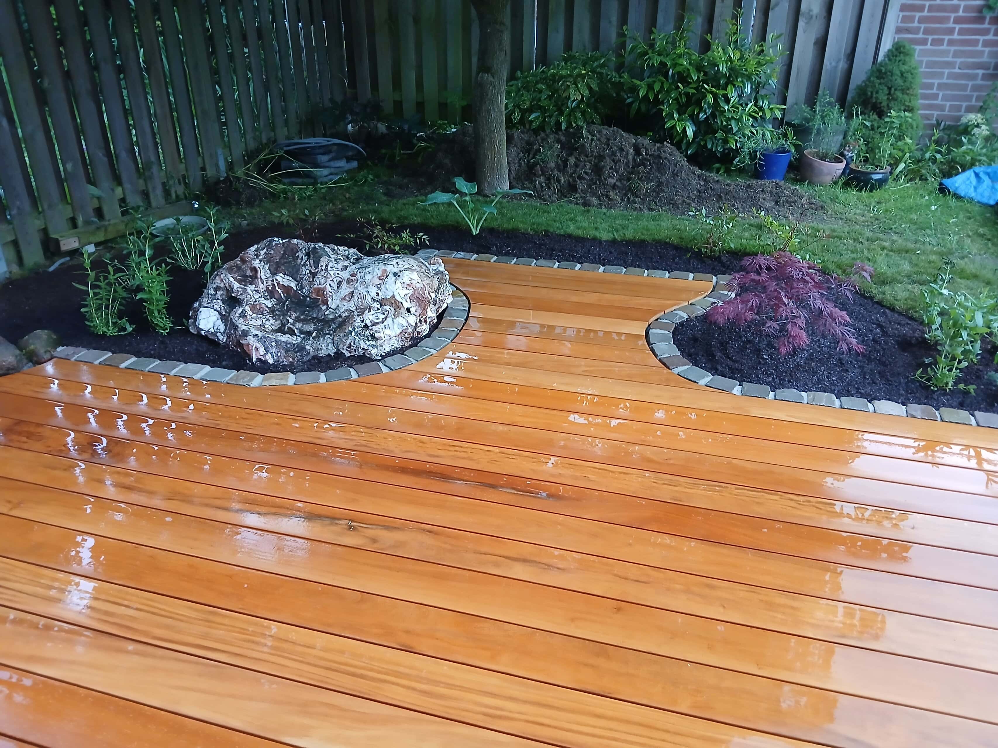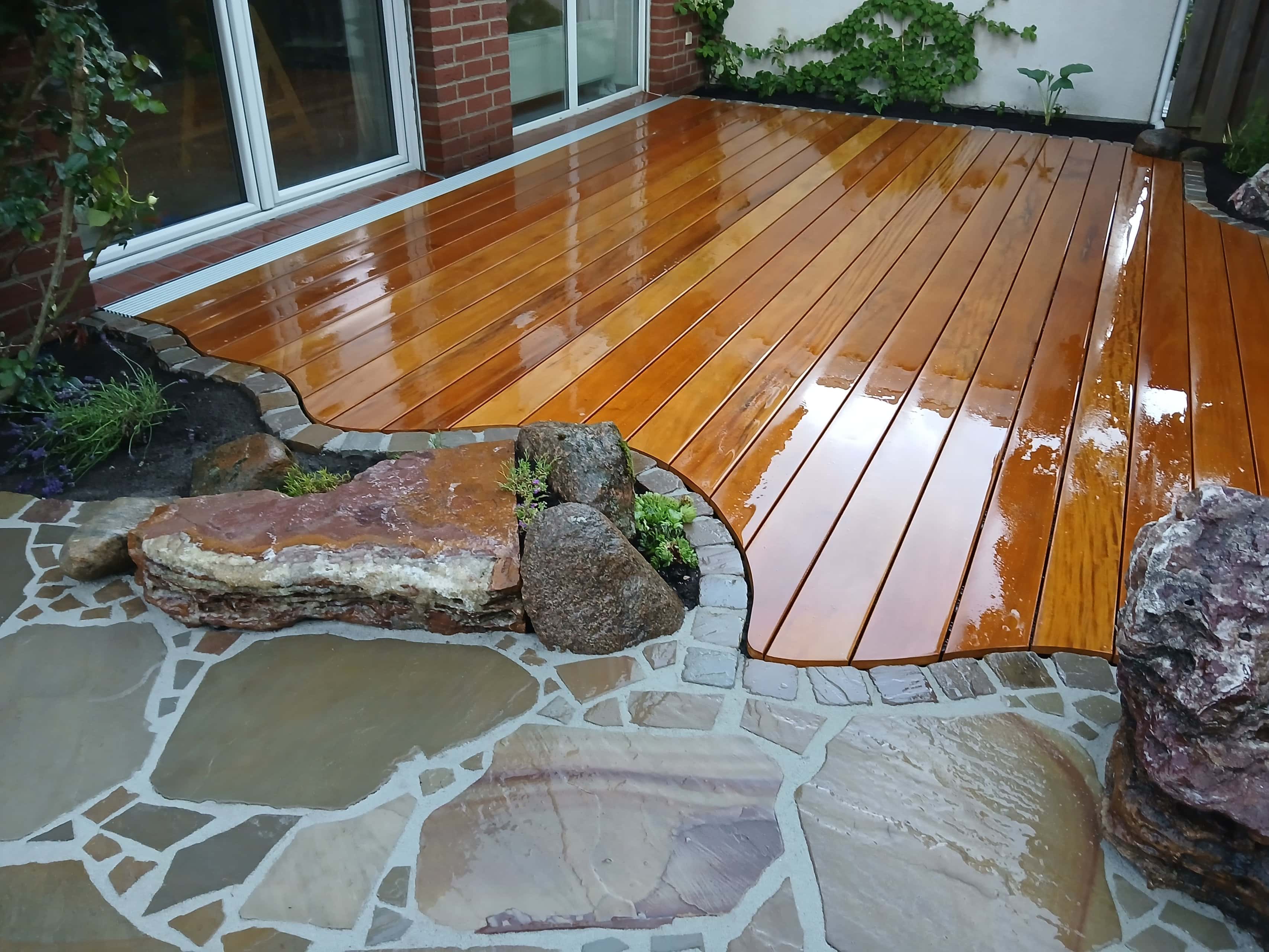 Freiformterrasse aus Garapa-Holzdielen mit Polygonaler Natursteinfläche