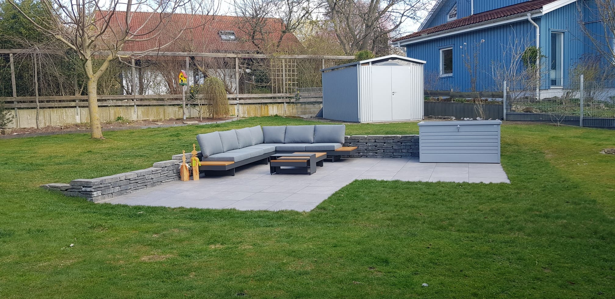 Die dunkelgrauen 60cmx60cm-Platten mit dezenter Musterung wirken modern und zurückhaltend. Ein fließender Übergang zur Rasenfläche sorgt für eine offene, natürliche Gestaltung.