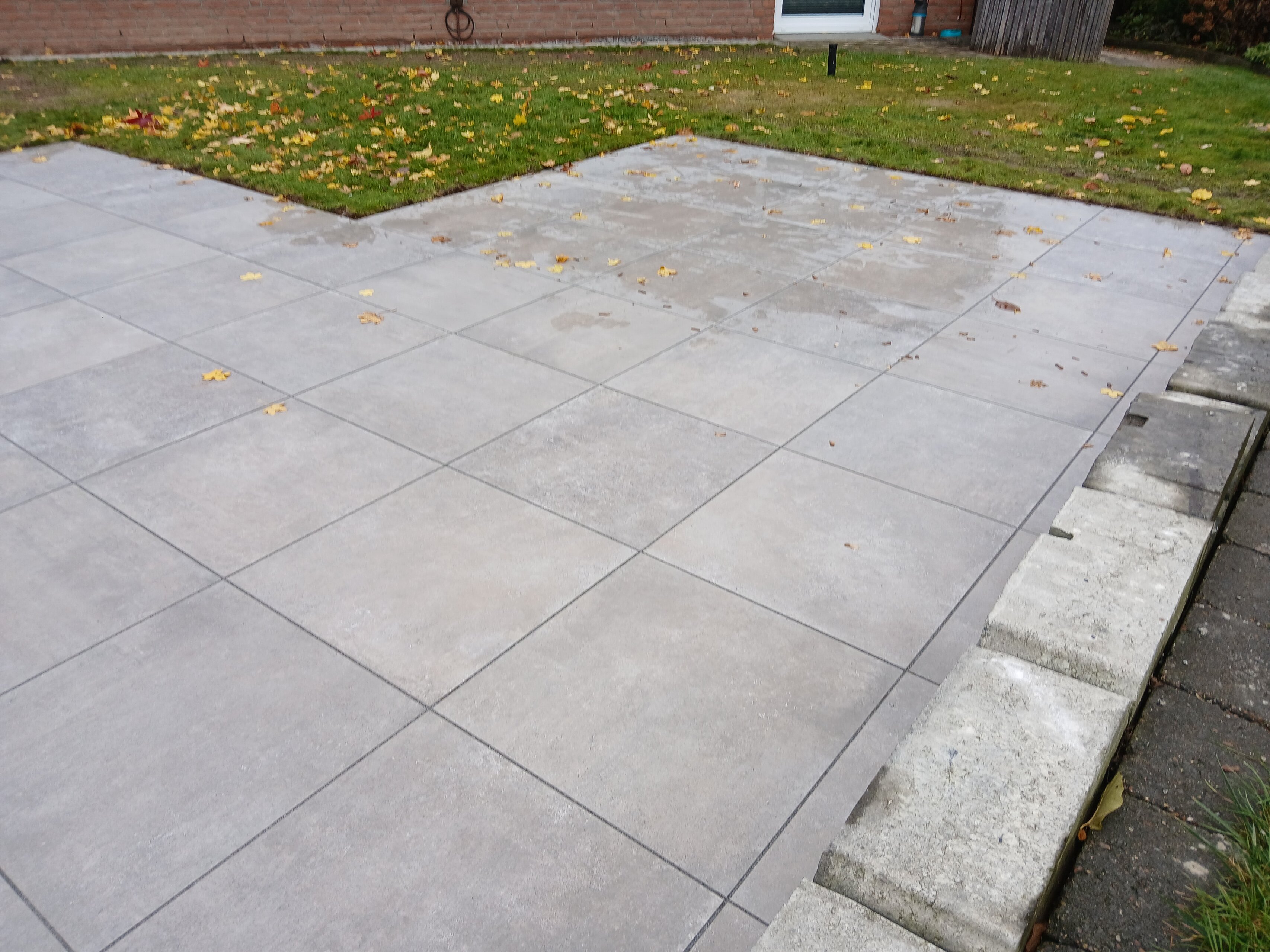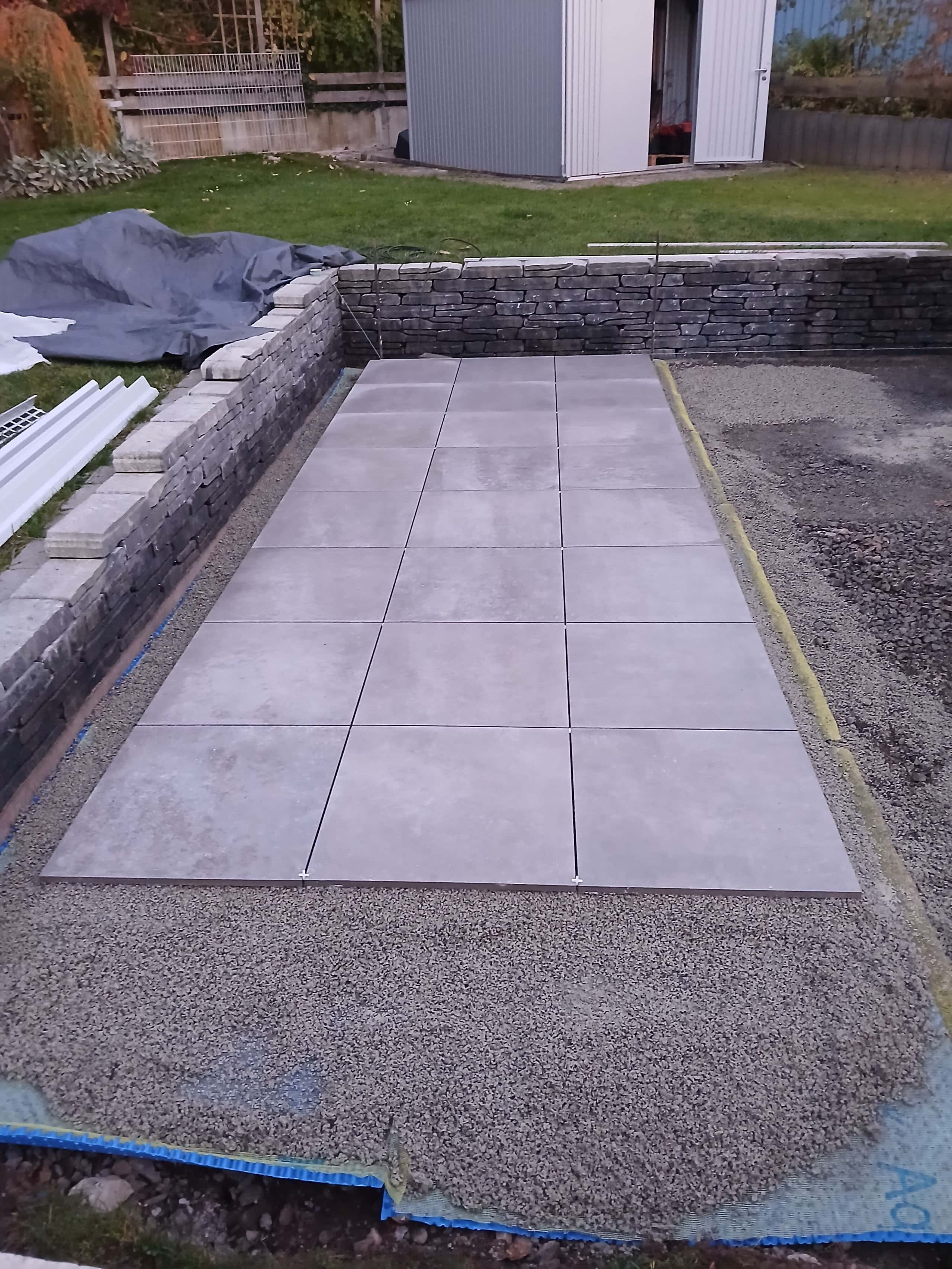 Hier wurde eine Terrasse aus italienischer Feinkeramik in L-Form realisiert, die sich elegant an eine bestehende Mauer anschließt.