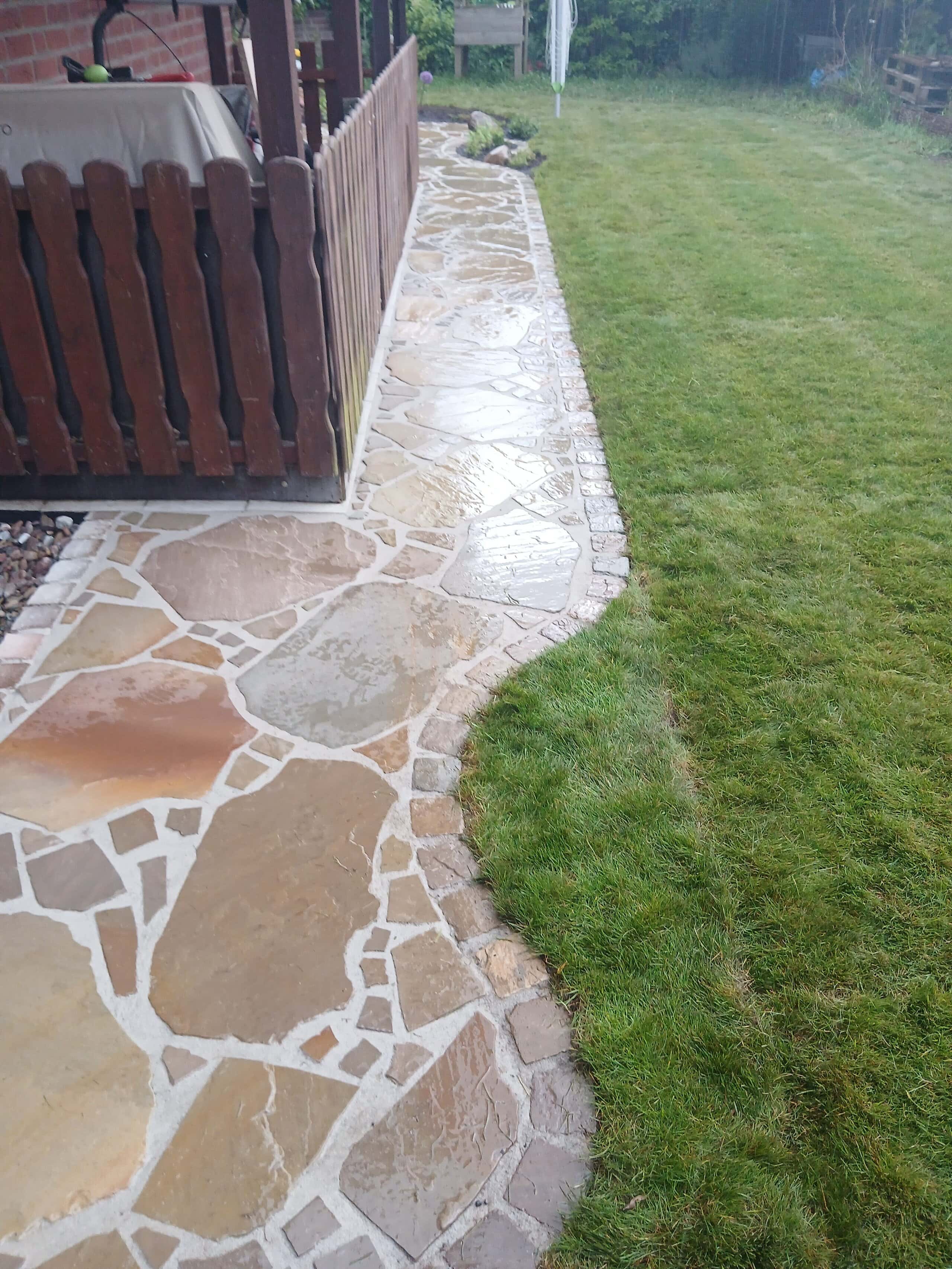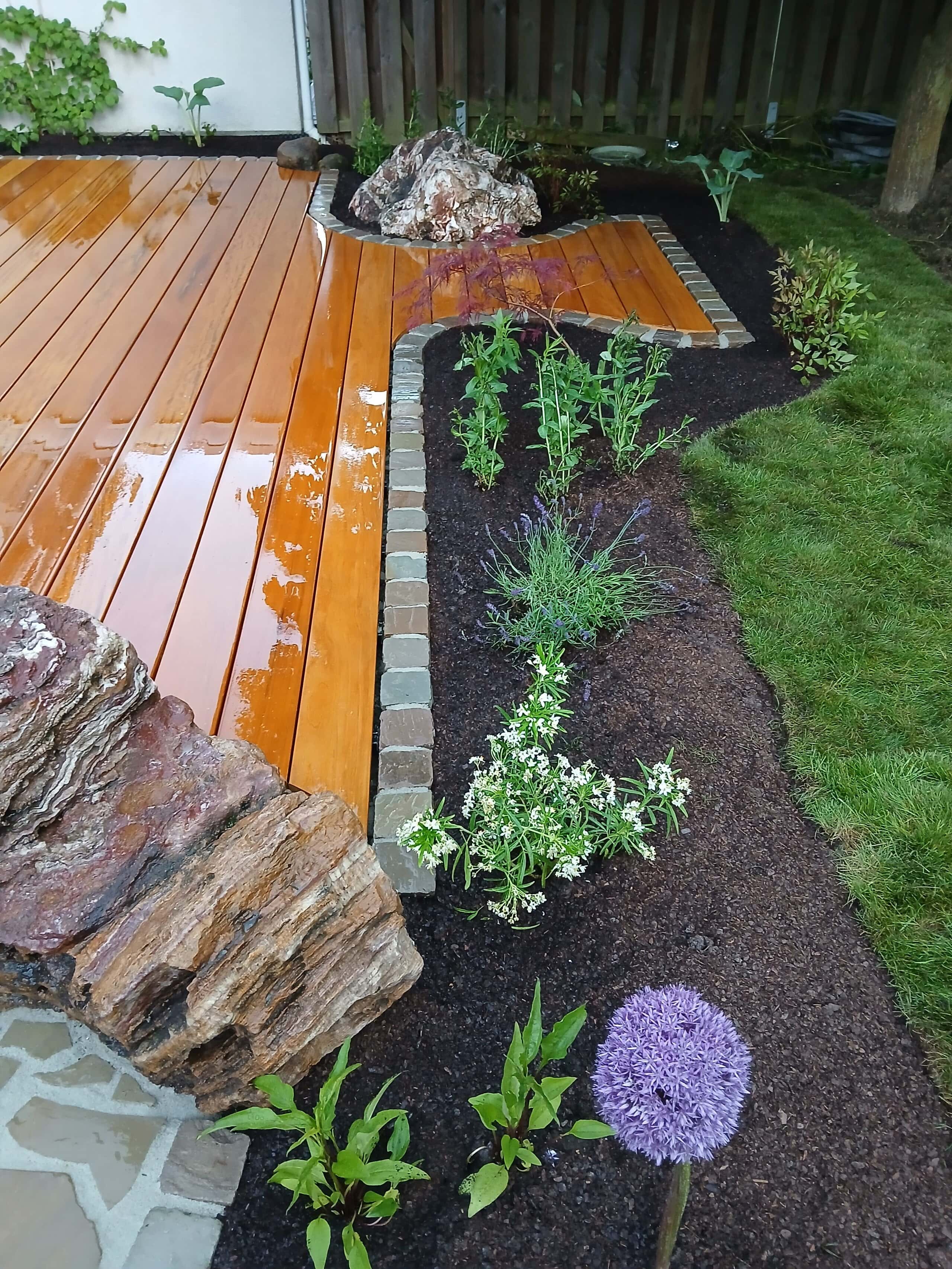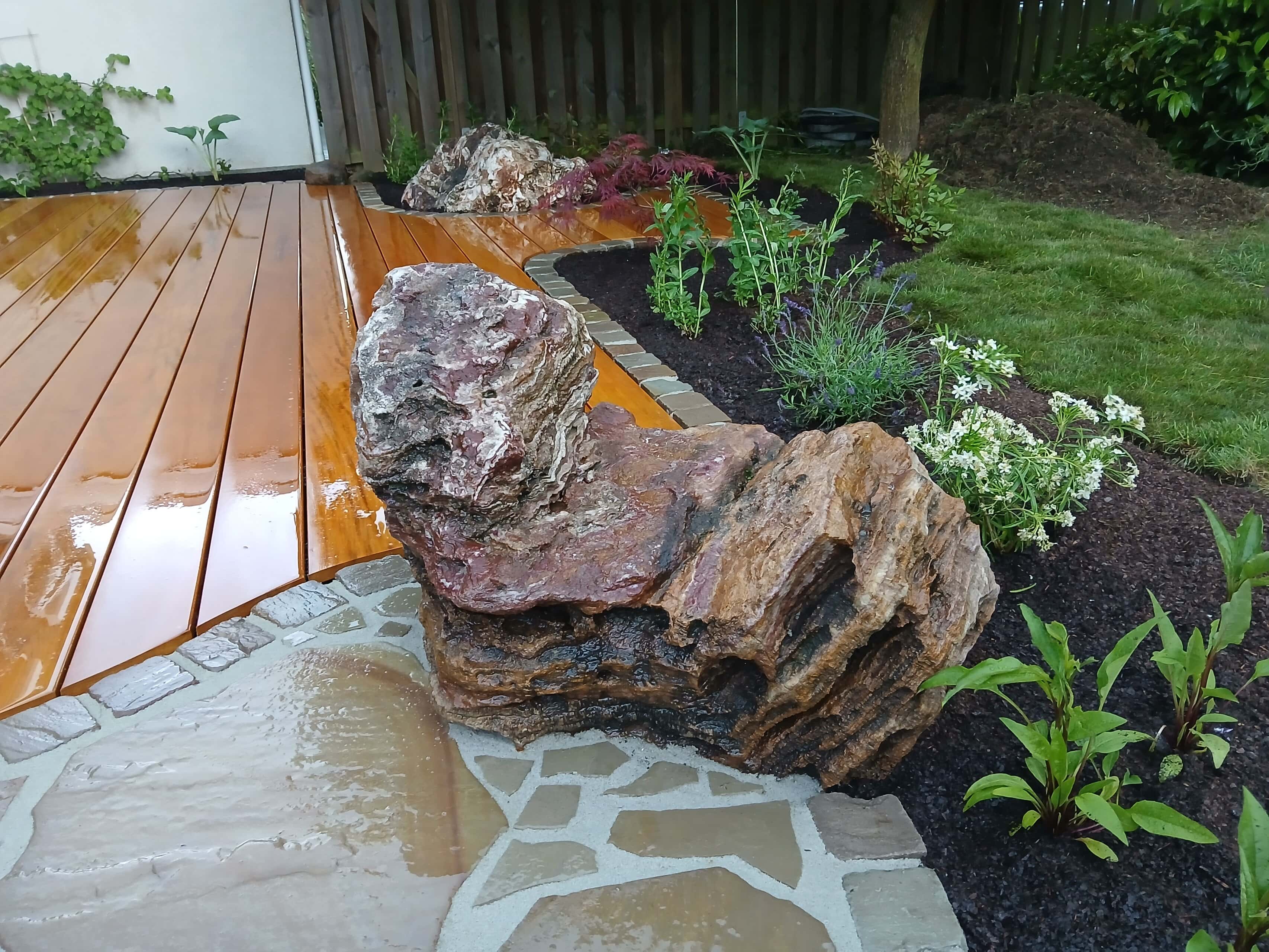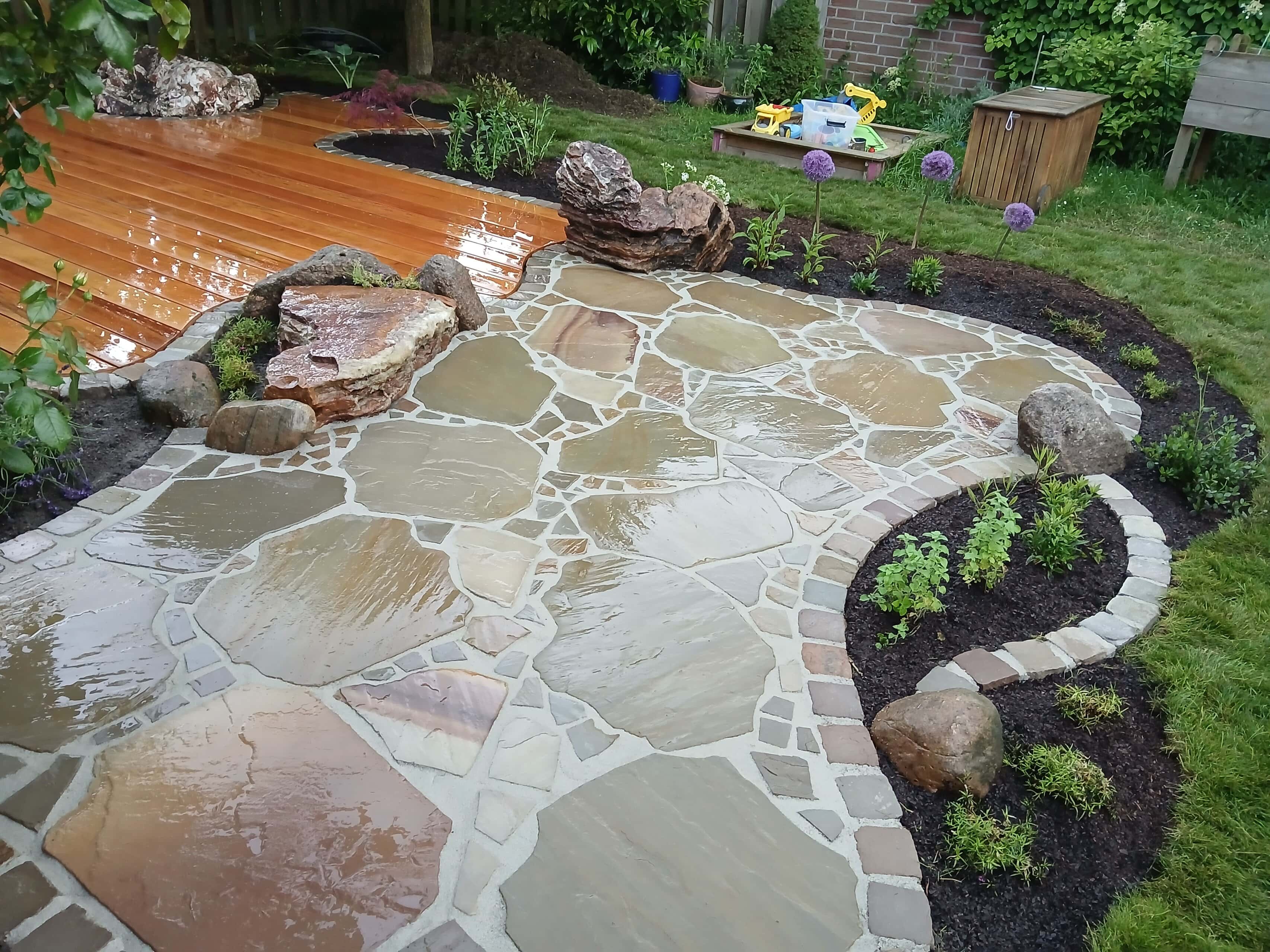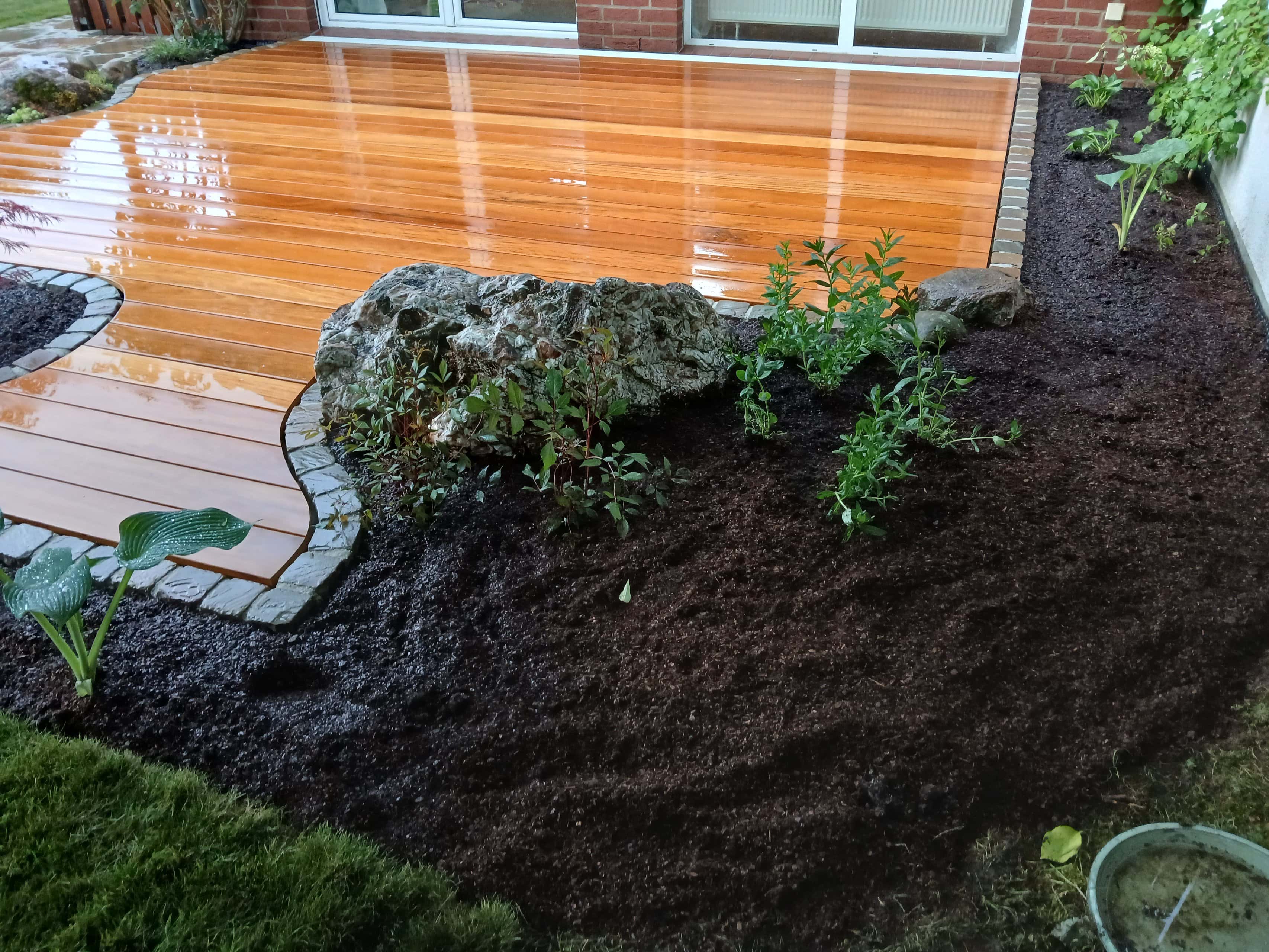 Diese Freiformterrasse kombiniert warme Garapa-Holzdielen mit einem polygonalen Sandsteinweg und schafft so einen harmonischen, natürlichen Außenbereich. Die Terrasse geht fließend in eine polygonale Sitzfläche über, die sich in eine Zuwegung fortsetzt. Große Findlinge setzen Akzente zwischen Holz und Stein, während Beete mit Bepflanzung den Garten lebendig und einladend machen. Ein einzigartiger Raum zum Entspannen, Genießen und Verweilen – individuell geplant und präzise umgesetzt.