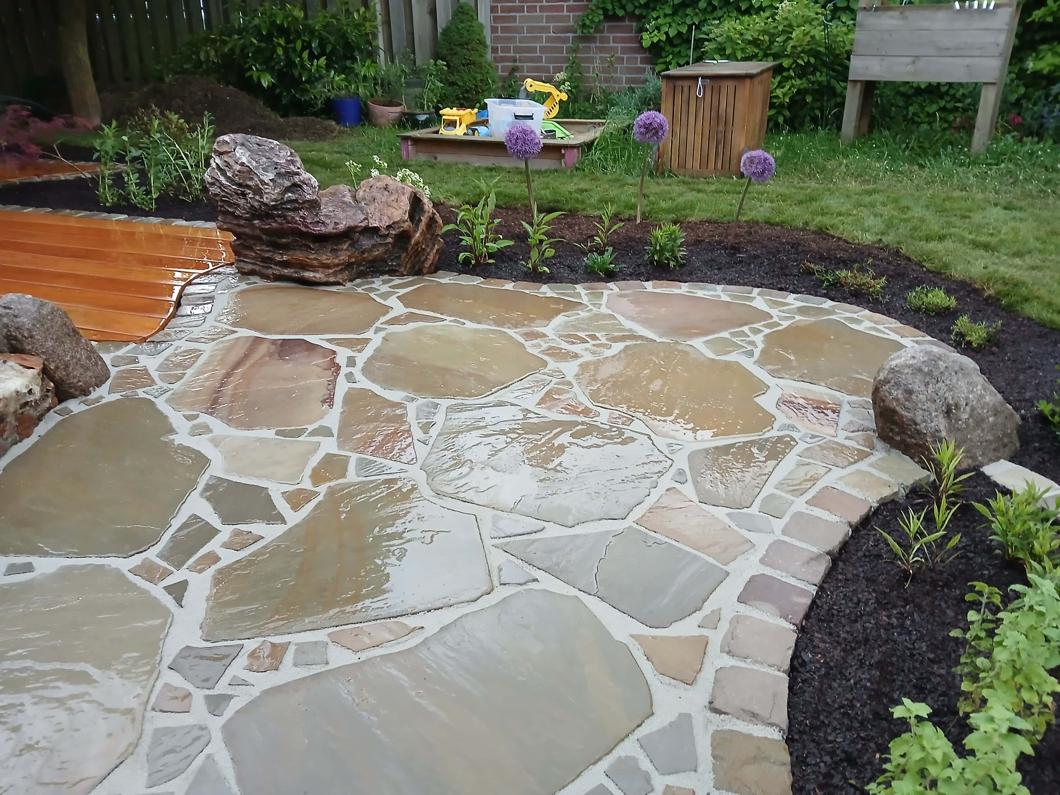 Dank sorgfältiger Auswahl hochwertiger Natursteine entstehen Terrassen, die robust, langlebig und pflegeleicht sind.